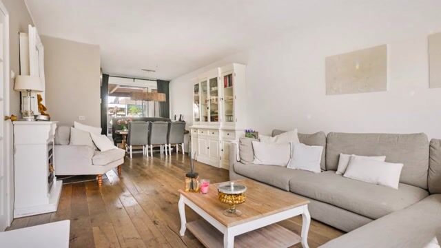 You enter the home via the front garden. The hallway contains the meter cupboard, under-stairs cupboard, and a toilet. The living room is wonderfully bright thanks to the large windows and flows seamlessly into the open kitchen. The kitchen has a modern design and is equipped with various built-in appliances, including a fridge-freezer, dishwasher, oven, coffee machine, and a 4-burner induction hob with extractor hood, finished with a stylish granite worktop.