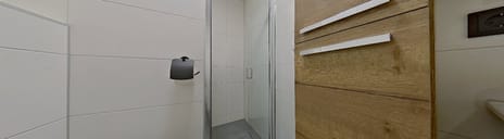oNieuwe badkamer met ruime douchehoek + ingebouwd douchebankje