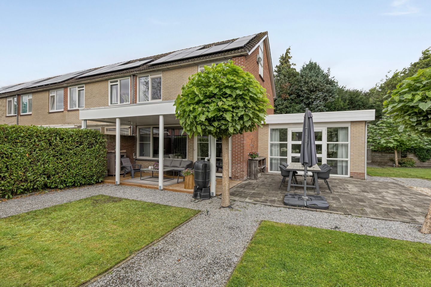 De tuin van de woning is op het zuiden gelegen. Vanwege de grootte zijn er altijd zonnige plekken, maar ook is er ook voldoende schaduw. Middels de tuindeuren in de woonkeuken is de tuin bereikbaar maar ook vanuit de woonkamer loopt u zo door naar de prachtige, op het zuiden gelegen terrasoverkapping. Hier geniet u het hele jaar door van het buitenleven, met maximale zonuren én beschutting bij minder weer.