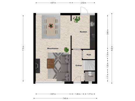 Via de entree komt u binnen in de hal met het toilet, de meterkast en de trapopgang naar boven. Vanuit de hal loopt u door naar de woonkamer.