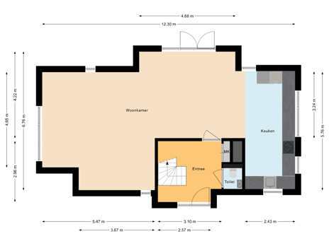 U betreedt de woning via een royale hal met moderne toilet, meterkast, garderoberuimte en toegang via de trap naar de eerste verdieping.