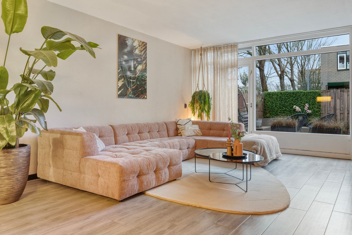 De ruime woonkamer kijkt uit op de zonnige tuin waar je in de zomer heerlijk kunt relaxen of borrelen met vrienden en familie. De tuin is bereikbaar via openslaande deuren.