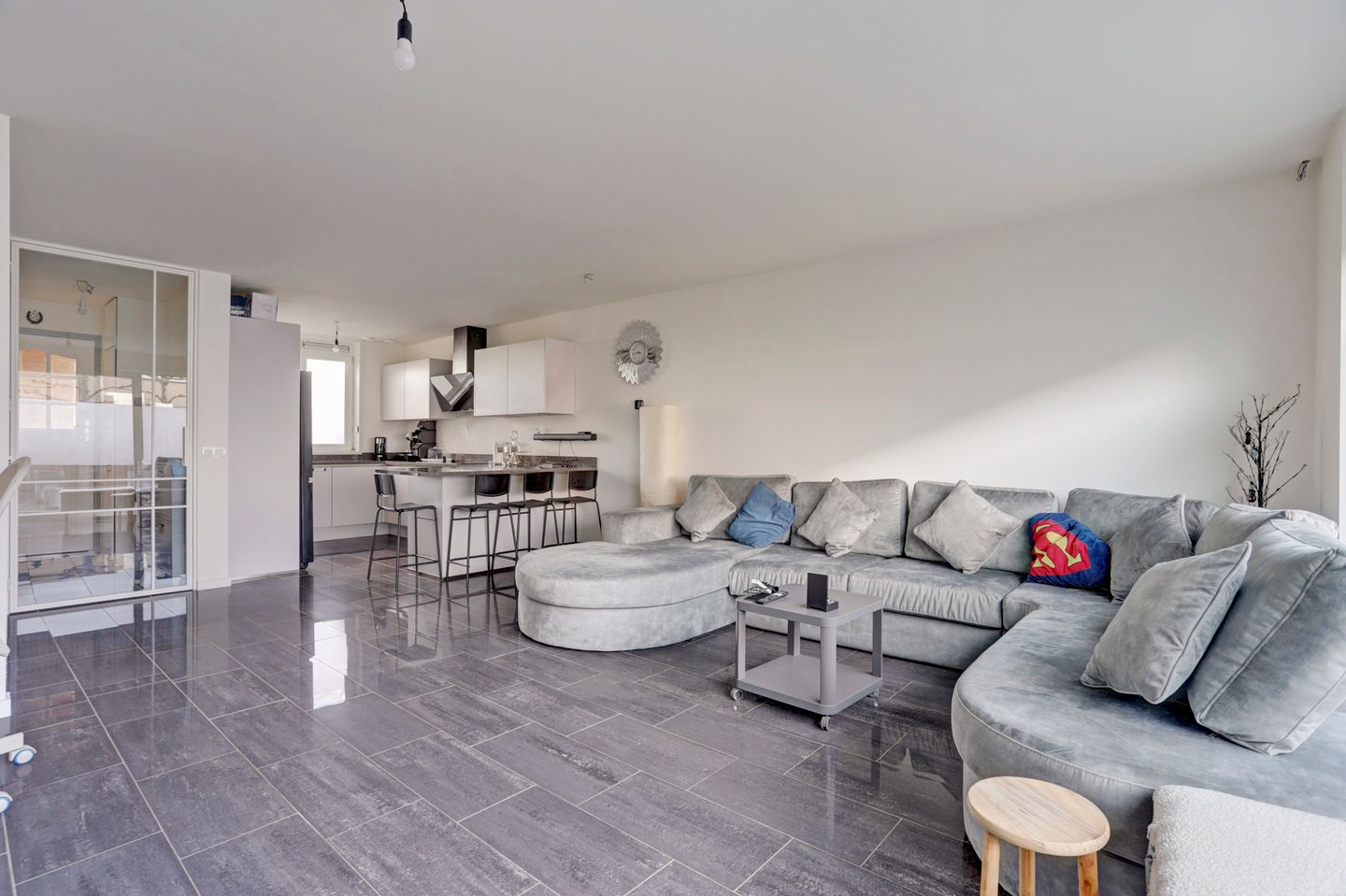 De sfeervolle woonkamer (ca. 30 m²) is voorzien van een schitterende plavuizenvloer, vloerverwarming (hoofdverwarming), licht gesausde wanden, ingebouwde verlichting, een handige voorraadkast en een grote schuifpui die zorgdraagt voor een zeer prettige lichtinval.