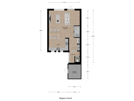 - 48 m² (9,50 meter diep en 5,10 meter breed)