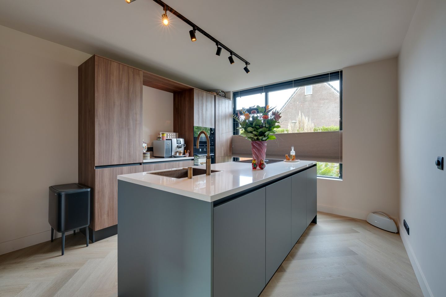 De woning straalt luxe en stijl uit dankzij een PVC-visgraatvloer met vloerverwarming, hoge witte plinten, strak gestucte wanden en plafonds, en zwarte kozijnen die het geheel een moderne touch geven. De ruime en lichte woonkamer biedt volop leefruimte en staat in verbinding met de schitterende keuken aan de voorzijde van het huis.