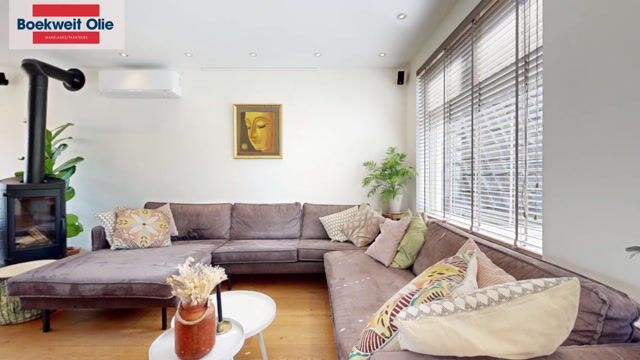 Eerste verdieping: overloop met 2e toilet (2022), open keuken met uitgebreide keukenunit voorzien van een verhoogd granieten aanrechtblad, 5-zones inductiekookplaat, afzuigkap, oven met magnetronfunctie, vaatwasser op hoogte en losse koelkast en vriezer, ruime 2e woonkamer met veel lichtinval, sfeervolle houtkachel, elektrische zonwering aan beide zijden van het pand, gestuukte wanden, airco (2025) en via schuifpui toegang tot fijn dakterras.