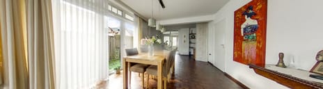 De woning beschikt over een diepe, fraai aangelegde tuin met diverse beplanting en een groene uitstraling. Dankzij de combinatie van een overdekt terras en open zitruimte is er op elk moment van de dag, en bij elk weertype, een fijne plek om buiten te zitten en te genieten van de tuin.