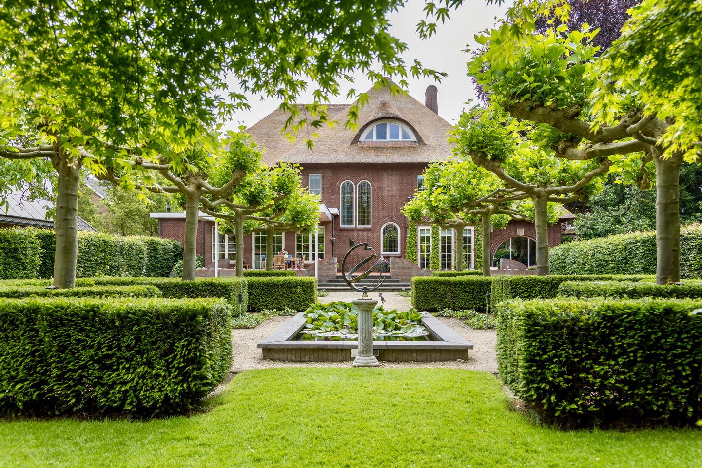 Blikvanger in de achtertuin is de grote vijver, waar eendjes regelmatig zwemmen. Het grote tuinhuis is door eiken schuifdeuren deelbaar in 2 compartimenten. Een houtkachel zorgt voor comfort en door het openen van alle deuren is er via een grote vlonder direct contact met de vijver en de tuin. Naast de tweede, strak vormgegeven vijver met waterplanten staat een klassieke zonnewijzer.