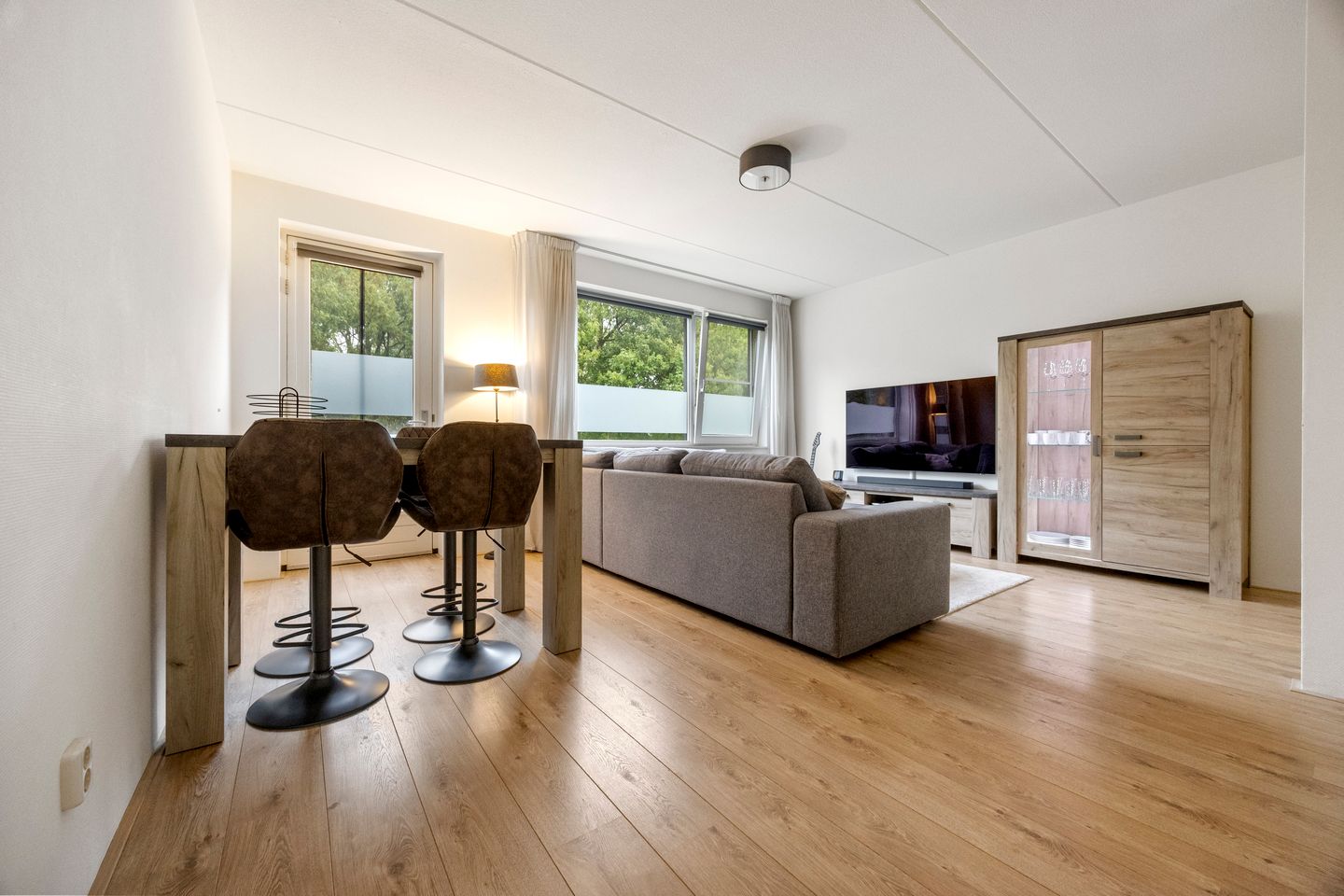 Het appartement ligt op de eerste verdieping en is bereikbaar via zowel trap als lift. De hal biedt toegang tot alle vertrekken, heeft ruimte voor een garderobe en geeft toegang tot de meterkast. Deze is voorzien van een kastdeur en glasvezelaansluiting. In het gehele appartement zijn de wanden strak afgewerkt, daarnaast is zorgt de lichtbruine laminaatvloer welke is doorgelegd in de gehele woning, voor een rustige, warme uitstraling. Aan het einde van de hal bevindt zich de toegang tot de woonkamer. Deze beschikt over een grote raampartij (voorzien van hor) met houten kozijnen en een deur naar het balkon. Het balkon is vierkant van vorm – een fijne plek om van de buitenlucht te genieten. De in gebroken wit uitgevoerde keuken, geplaatst in 2009, is uitgerust met een bruin werkblad, een combi oven/magnetron, vaatwasser, 4-pits kookplaat, afzuigkap, koelkast en vriezer.