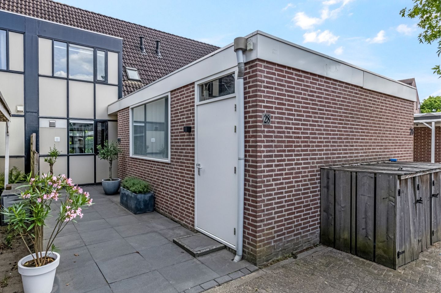 De tuin is ook bereikbaar via achterom, dankzij een deur in de schuur die direct uitkomt op het plein achter het huis.