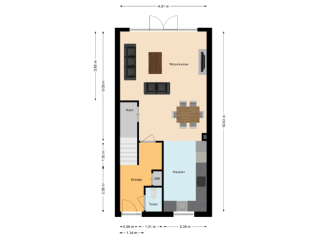 - 45 m² (9,00 meter diep en 5,00 meter breed)