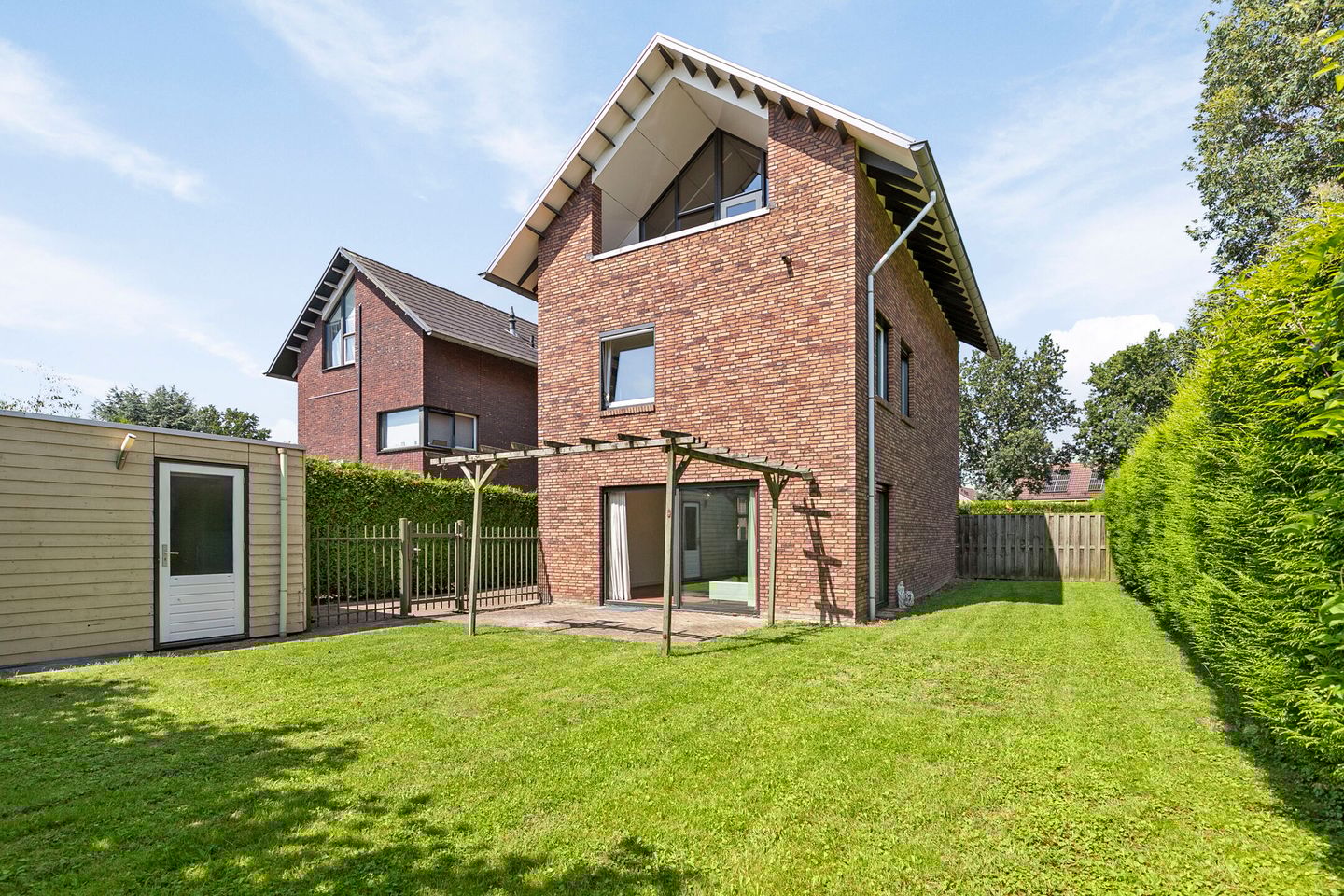 De woning heeft een tuin rondom, waarbij de achtertuin op het zuidoosten is gelegen. De achtertuin is eenvoudig/praktisch aangelegd, goed onderhouden en biedt veel groen gras en een terras. De tuin is deels omheind met een groene haag en aan de achterzijde een schutting. Tussen de woning en de garage is de tuin afgesloten door een laag hekwerk.