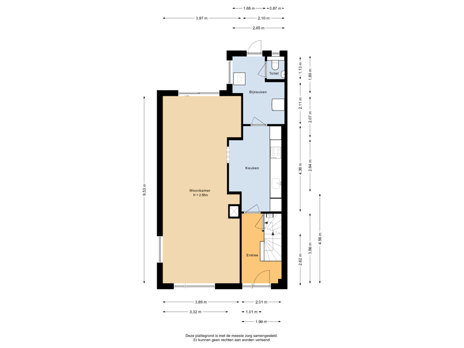Entree, hal met meterkast, kelderkast, nette keuken met inbouwapparatuur, praktische bijkeuken met achterom, toilet met fontein, woonkamer met open haard en schuifpui naar de tuin.