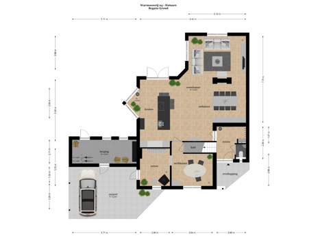 Begane grond: overdekte entree aan de rechterzijde naar de ruime hal met verzorgd toilet (v.v. wandcloset, hoekfontein en raam), moderne meterkast, verlichte trapopgang en deur naar de royale woonkeuken annex woonkamer. Het grote kook- en spoeleiland vormt een verbindend middelpunt en herbergt een 5-zone-inductiekookplaat, downdraft geïntegreerde afzuiging, vaatwasmachine en extra grote spoelbak met kokendwaterkraan en zeepdispenser (beiden Quooker). Er is ruimte voor 4 barkrukken om te genieten van bijvoorbeeld een ontbijt. De kastenwand bezit een manshoge koelkast, separate 4-ladenvriezer, stoomoven en een combimagnetronoven. Voor de inbouwapparatuur is gekozen voor Siemens en ook de rest van de keuken is van de hoogste kwaliteit: hoogglans wit, greeploos en een strak en robuust composieten werkblad uit één geheel.