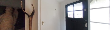 Vanuit de keuken is toegang tot de extra kamer op de begane grond. Dit aan de voorzijde gelegen vertrek is multifunctioneel en biedt meerdere gebruiksmogelijkheden: van speelkamer tot praktijk- of kantoorruimte. Een praktische schuifdeur verleent vanuit deze kamer toegang tot de met plavuizen ingerichte tweede entree/ontvangstruimte met garderobe, plek voor enkele stoelen. Verholen zijn hier de aansluitingen voor de wasmachine en droger en de vloerverwarmingsverdeler. Deze tweede entree biedt een buitendeur naar de brede carport en oprit (plek voor 2 auto’s).