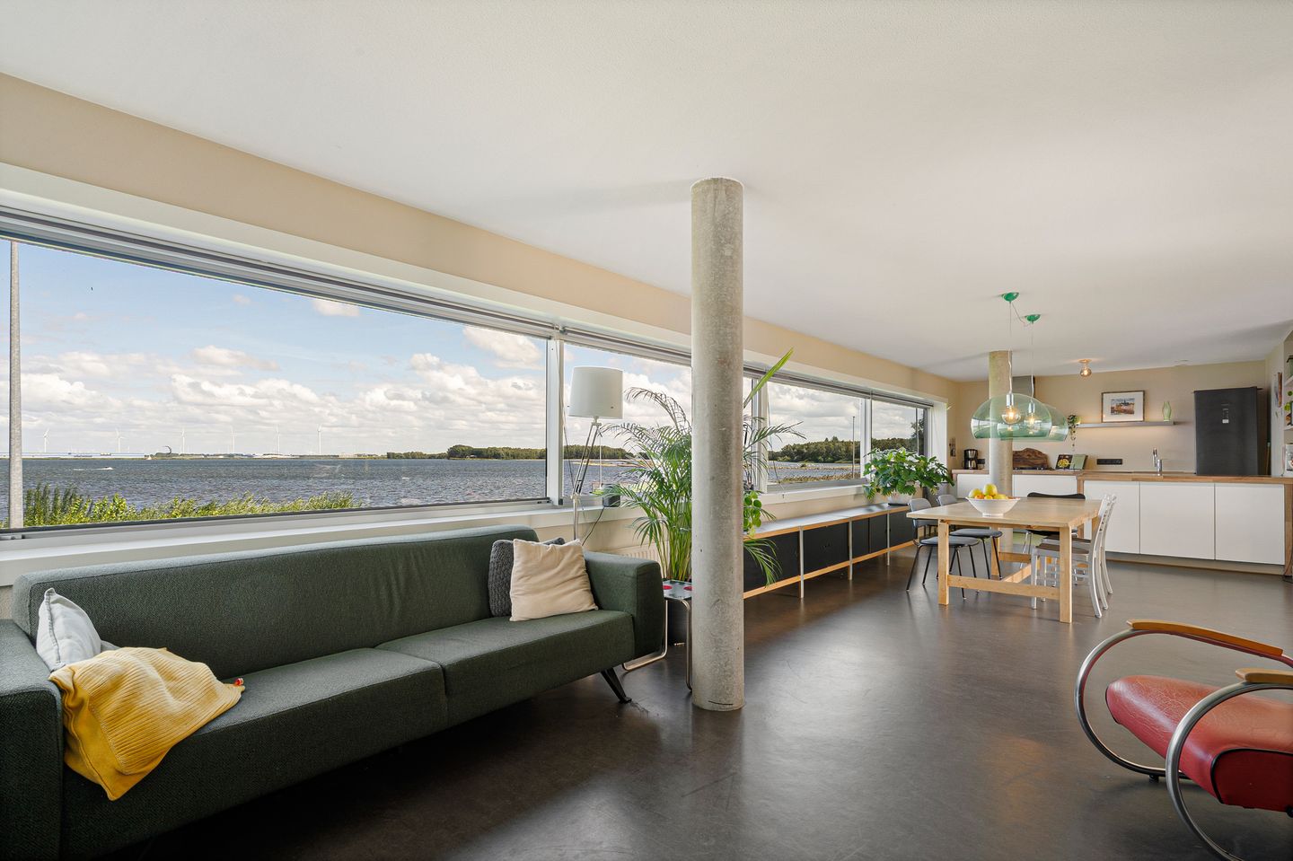 Sommige huizen hebben iets bijzonders. Ze verrassen je. Door de ruimte, het licht of het uitzicht. En soms komt alles samen. Gooimeerpromenade 88 is er zo één. Een woning over de volle breedte van meer dan twaalf meter, met kenmerkende horizontale raampartijen waardoor je bij binnenkomst direct zicht hebt op het water. Je blik trekt direct naar buiten: een levend schilderij van licht, lucht en ruimte. Het uitzicht is ieder moment van de dag anders en verveelt nooit. Of je nu 's ochtends met een kop koffie aan de eettafel zit of 's avonds met een glas wijn op het dakterras, hier draait het om rust, ruimte en uitzicht.