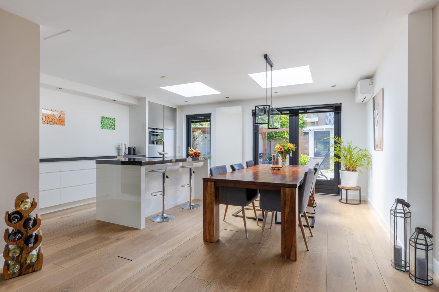 Moderne open keuken met luxe inbouwapparatuur en 6-pits gasfornuis. Twee lichtkoepels zorgen voor extra daglicht. Vanuit de keuken toegang tot de tuin.