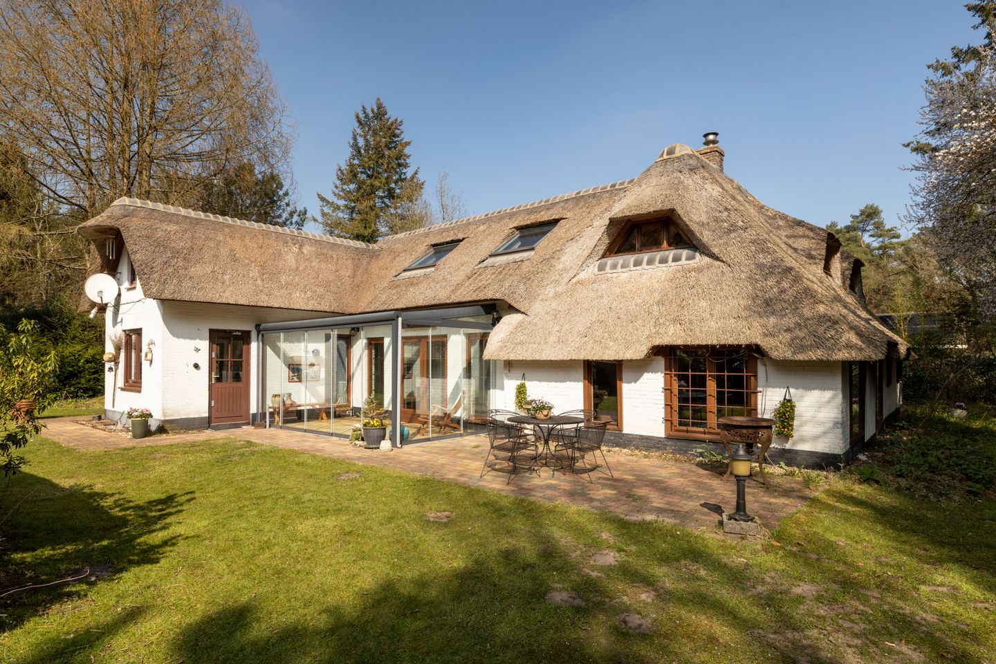 Het oorspronkelijke huis is gebouwd in 1936 en opgetrokken in steen en grotendeels voorzien van spouwmuren. In 1992 is het fors uitgebouwd en daarmee de verbinding gemaakt met de voormalige garage wat nu woonkeuken is. Dakbedekking middels een rieten deken, die in 2004 vernieuwd is en in 2016 nog groot onderhoud heeft gehad. Het dak is geïsoleerd. Houten kozijnen met grotendeels dubbele beglazing. Voor de verwarming en het warm water is er een cv-combiketel (bouwjaar 2004). Energielabel E.