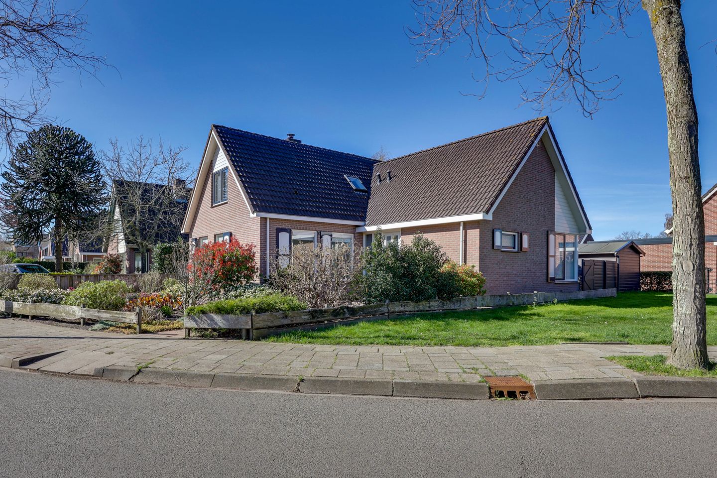 Aan de linkerzijde bevindt zich de garage (ca. 21 m²) met dubbele houten deuren aan de voorzijde en een loopdeur aan de achterzijde. De achtertuin, gelegen op het westen, is ingericht met twee vrijstaande houten schuren en een overkapping.