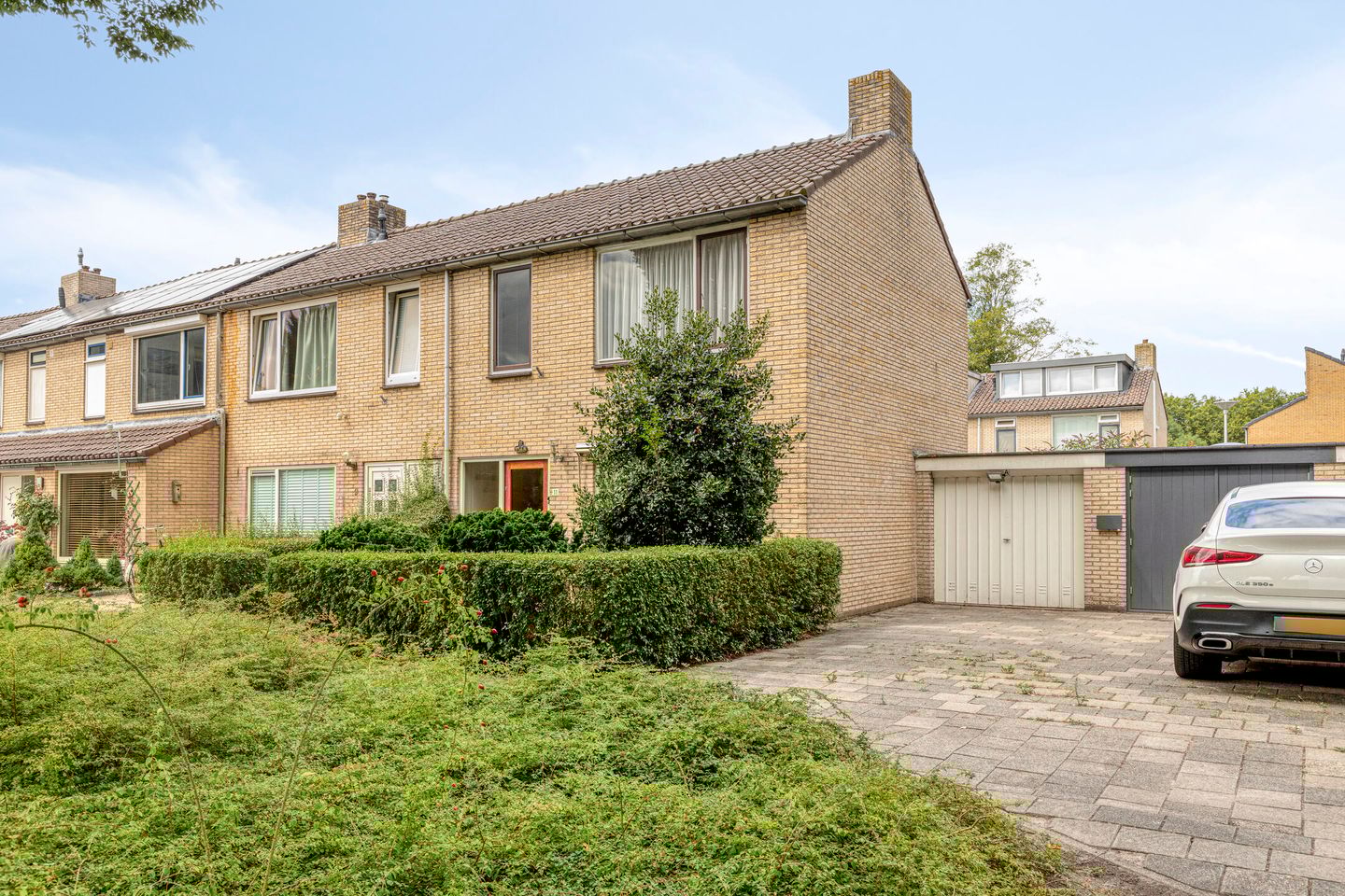 Aan de voorzijde van de woning ligt een verzorgde voortuin met daarvoor een groenstrook van de gemeente. Aan de zijkant bevindt zich de garage.