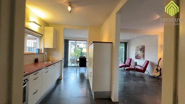 De begane grond is ruim opgezet en voelt licht en open aan, mede door de uitbouw over de volle breedte aan de achterzijde. Grote ramen en openslaande deuren zorgen voor prettig daglicht en een fijne verbinding met buiten. De keuken is geplaatst in 2001 en uitgevoerd in een rustige, tijdloze stijl met diverse inbouwapparatuur. De leefruimte is strak afgewerkt met een tegelvloer en vloerverwarming, wat zorgt voor comfort en een verzorgde uitstraling.