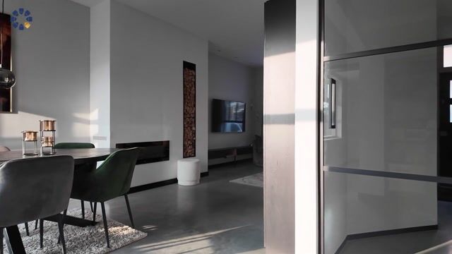 -Fraaie woonkamer met inbouwspots, elektrische haard, verhoogd plafond (2.80m) en vlinderbeton gietvloer