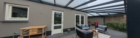 Grenzend aan de woning ligt een luxe ontspanningsruimte met bijkeuken met kastenwand t.b.v. wasmachine en wasdroger op hoogte, vaste kastruimte, toilet, douche en ruime sauna. Openslaande deuren verbinden de ruimte met de tweede overkapping en de tuin. Multifunctioneel inzetbaar als wellness, kantoor of atelier.