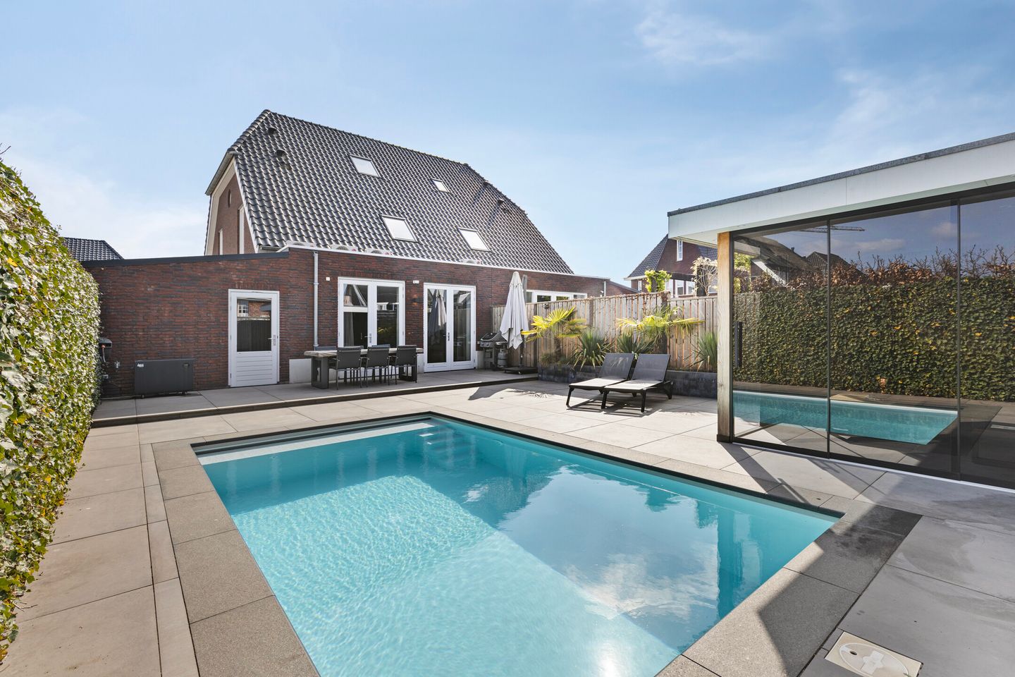Vanuit de keuken loop je zo de fraaie tuin in, waar je het hele jaar door van kunt genieten. Toch geniet je in de zomer net een beetje extra, dankzij het zwembad. De overkapping zorgt ervoor dat je ook bij iets minder lekker weer gewoon van de buitenlucht kunt genieten.