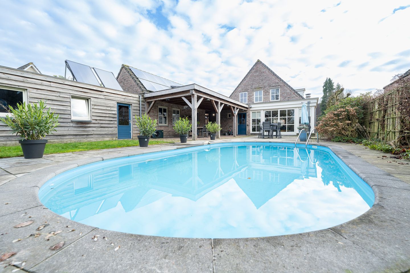 De tuin, die in winter wat kaal oogt, heeft in de zomer veel groen, sfeer van mooie bomen, een heerlijk terras, een grote en sfeervolle veranda en een prachtig zwembad dat via een warmtepomp eventueel verwarmd kan worden. Dit zwembad is tevens uitgerust met zout-elektrolyse water wat de hoeveelheid van benodigde chloor aanzienlijk verminderd. Wel zo comfortabel!