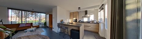 De moderne deur leidt naar de lichte woonkamer met een doorlopende tegelvloer van 100x100 cm (2021) en vloerverwarming. De zithoek aan de voorzijde biedt uitzicht op het groen, terwijl de tuingerichte eetkamer heerlijk zonnig is door de ligging op het zuiden.