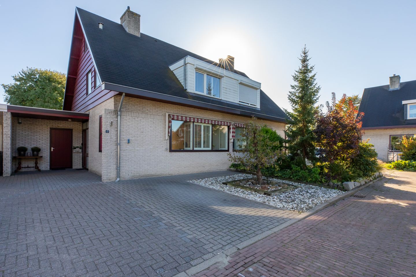 De voortuin is onderhoudsvriendelijk door de bijna volledige bestrating.