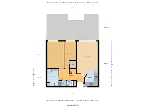 - 43 m² (4,73 meter diep en 9,70 meter breed)