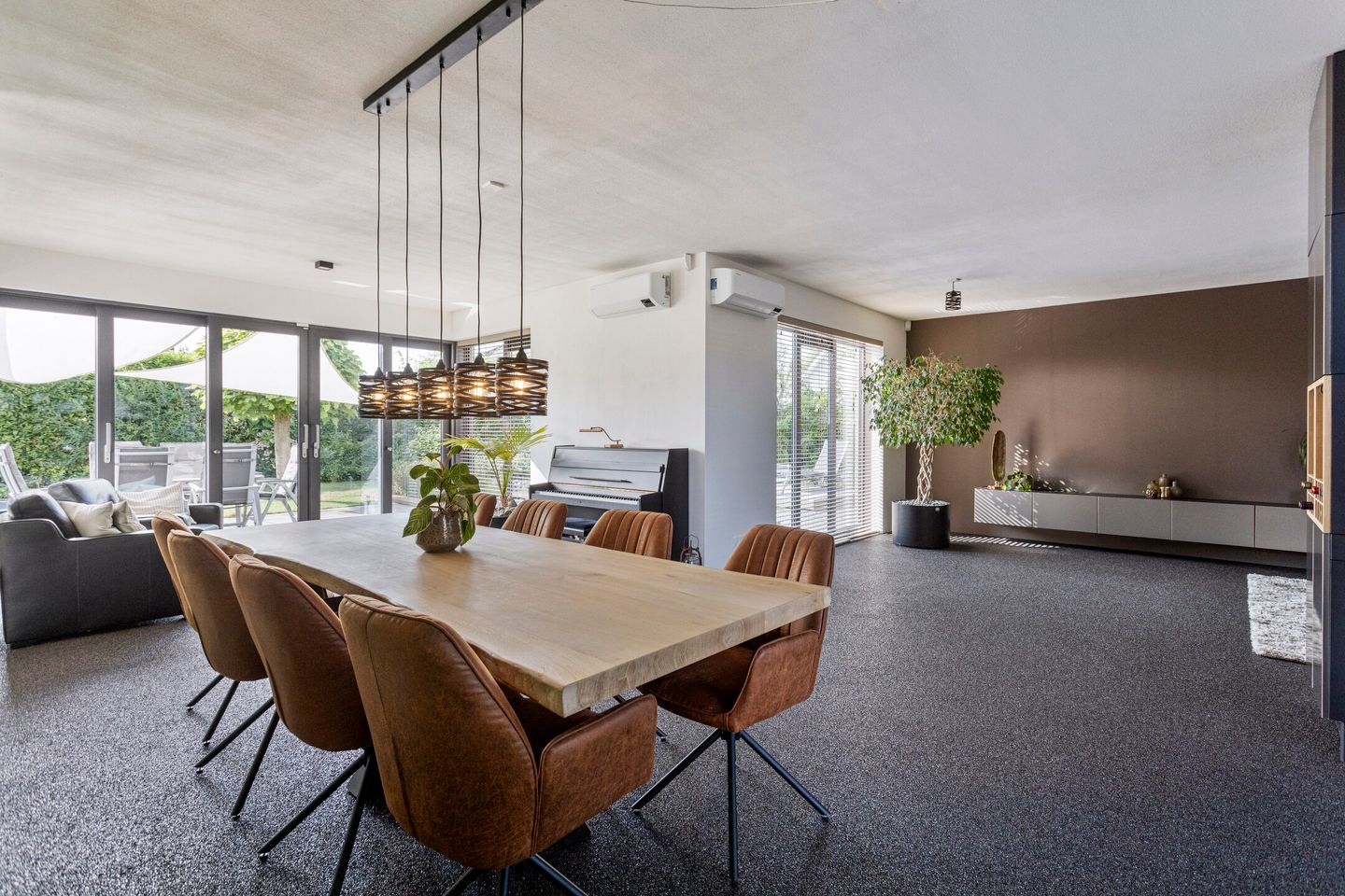 Moderne ruime woonkamer: Uitgevoerd met een stijlvolle siergrindvloer en strakke wanden.