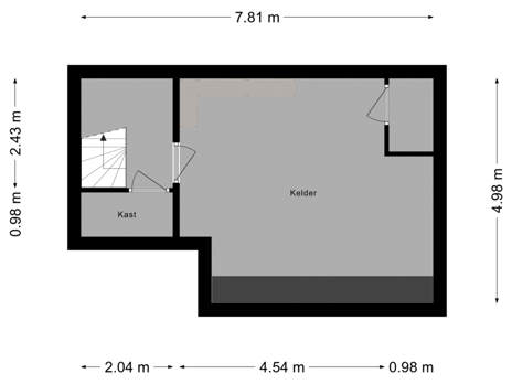 De kelder bestaat uit vier aparte ruimten. De trapruimte, met toegang tot de kruipruimten, een technische installatieruimte direct onder de meterkast van de entree, waar alle leidingen binnenkomen en een grote voorraadruimte waarin de woonhuis CV-combiketel is geplaatst in een separate afgesloten ruimte.
