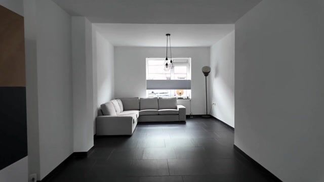 De woonkamer en open keuken zijn voorzien van grote raampartijen en een tegel vloer.