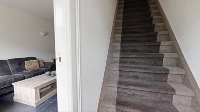 Entree: Via de voordeur bereik je de hal met directe trapopgang naar de eerste verdieping. Vanuit hier is er toegang tot de woonkamer. De hal is voorzien van vloerbedekking, structuurwanden en een plafond met spuitwerk.