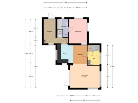 Hal met trapopgang en trapkast, woonkamer met open keuken, slaapkamer, badkamer, bijkeuken, toilet.