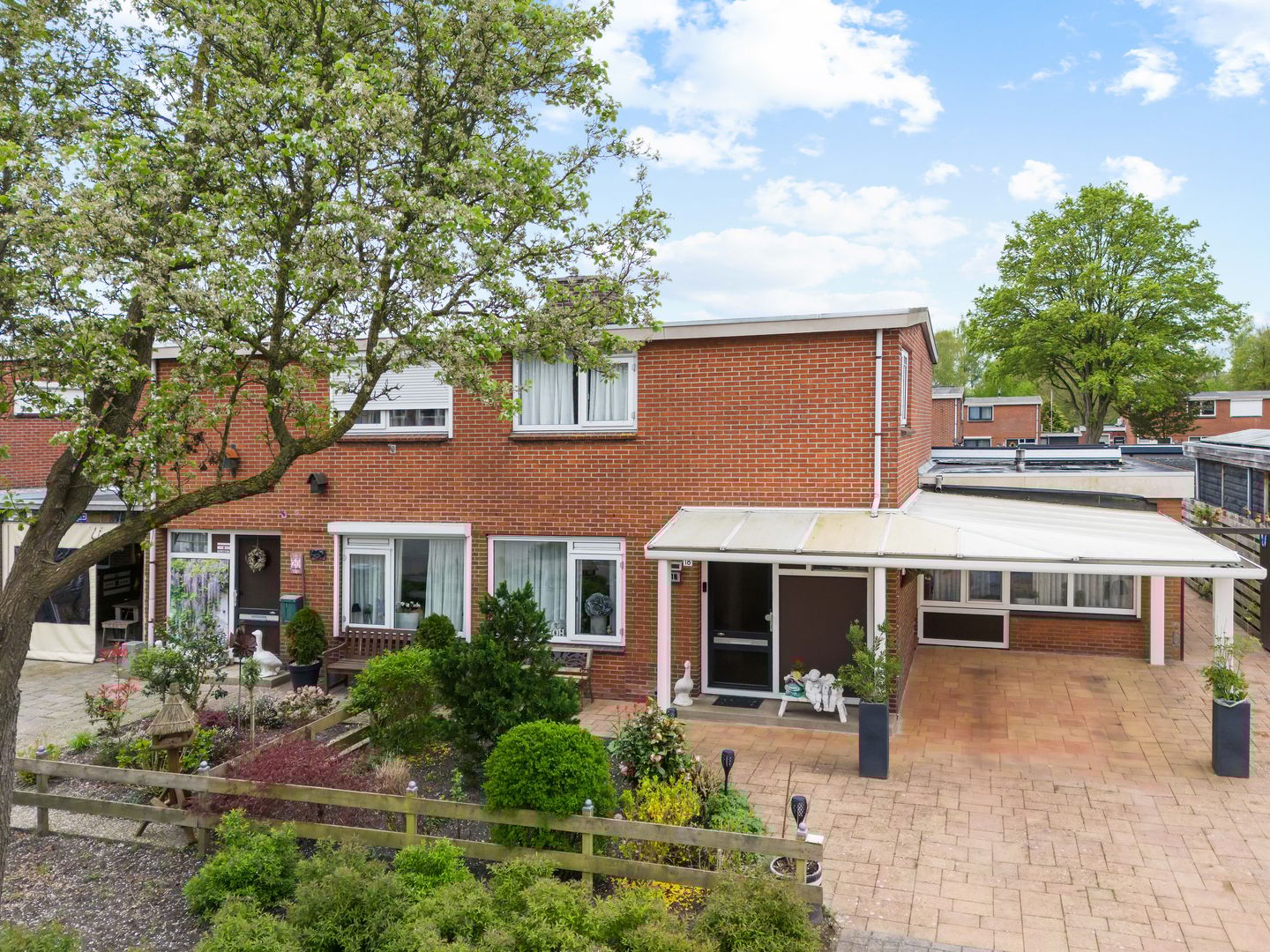 Tuin en bijgebouwen: deze woning wordt compleet gemaakt door een onderhoudsvriendelijke tuin op het zuiden, waar u optimaal kunt genieten van de zon. De stijlvolle aluminium serre/tuinkamer – voorzien van glazen schuiframen en een nieuwe zonwering – biedt een lichte en comfortabele extra leefruimte. Daarnaast beschikt de tuin over een ruime houten blokhut met elektra, ideaal als werkplek, hobbyruimte of extra berging. De ruime oprit en handige carport met doorlopende luifel naar de voordeur zorgen voor voldoende parkeergelegenheid en comfortabele toegang.