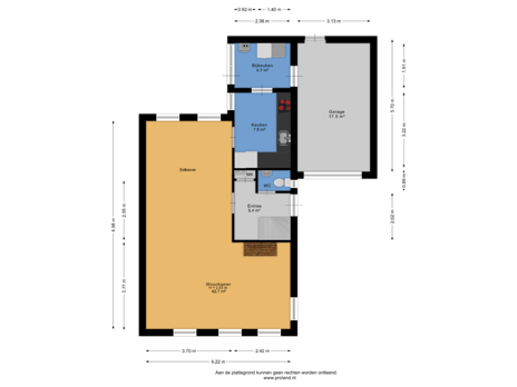 Begane grond: entree/hal met trapopgang, meterkast en toilet met fonteintje, sfeervolle woonkamer (ca. 42.7 m²) met eethoek, halfopen moderne keuken (ca. 7.8 m²) voorzien van inbouwapparatuur (o.a. inductiekookplaat, vaatwasser en oven), praktische bijkeuken (ca. 4.7m²) met witgoedaansluiting en toegang tot de garage (ca. 17.5 m²).