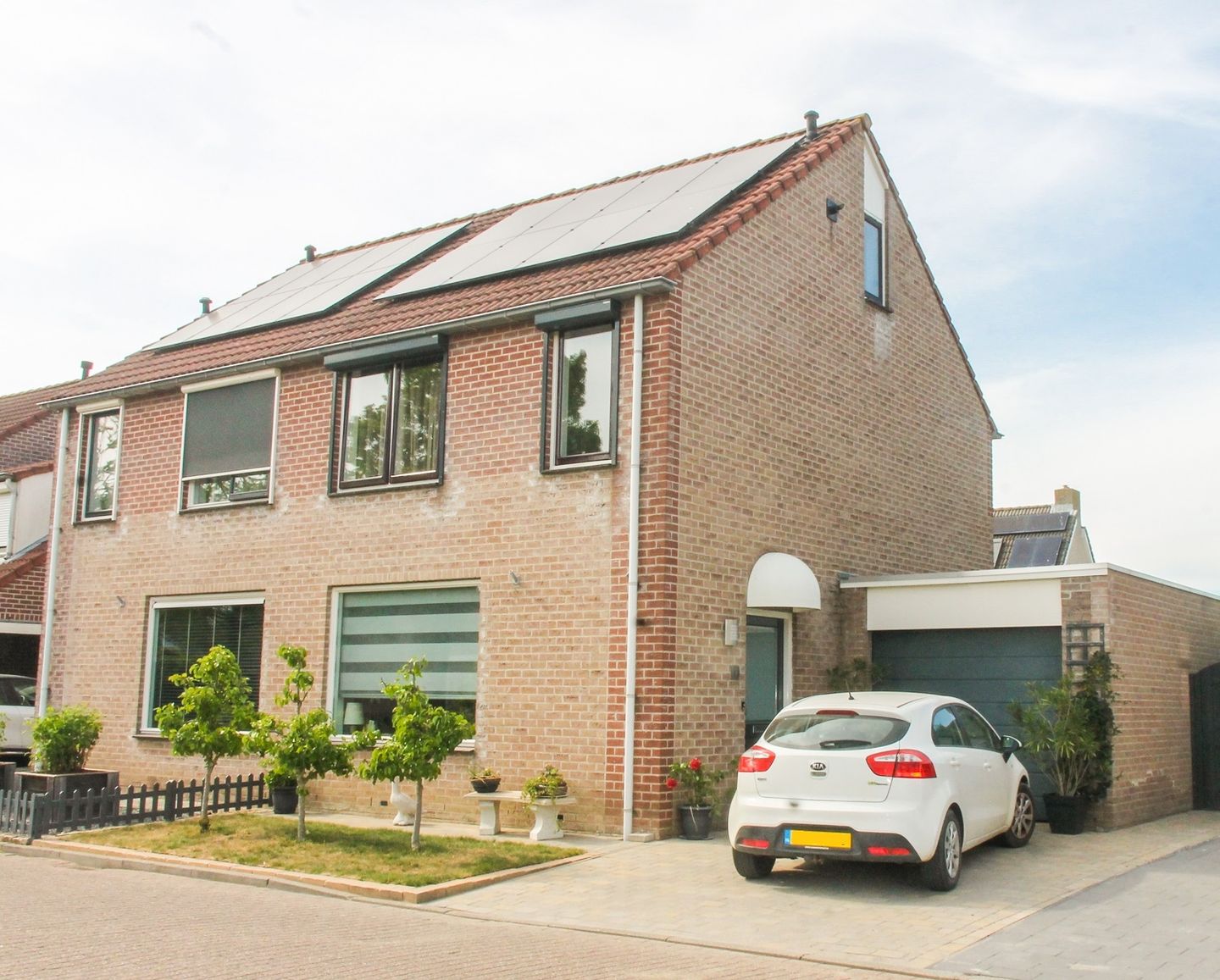 De woning beschikt over een ruime garage en een eigen oprit. In de zonnige tuin vind je een grote, moderne overkapping waar je het hele jaar door van het buitenleven kunt genieten. Dankzij het zonnescherm creëer je in een handomdraai een schaduwrijke plek op warme dagen. De tuin is netjes onderhoudsvriendelijk aangelegd.