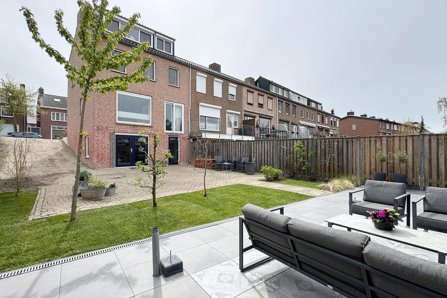 Wat een heerlijke buitenruimte. Direct achter de woning is een groot terras gelegen. Plaats genoeg voor een grote eettafel of een zwembad. Naast de woning is een brede afrit en daardoor is het ook mogelijk om met een auto beneden te komen of op het talud te parkeren. Verder is er een stukje gazon, zijn er borders en achterin de tuin is nog een tweede terras.