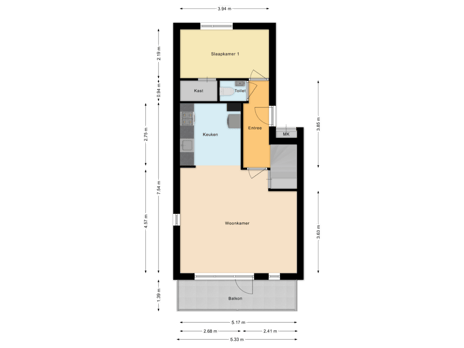 Toegang tot de entreehal met toilet en doorloop naar ruime woonkamer en slaapkamer.