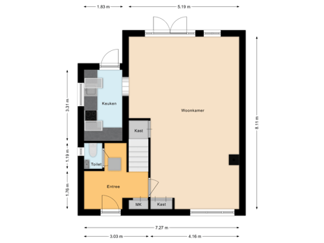Oppervlakte woonkamer: Circa 37,7m²