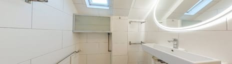 Overloop met toegang tot 3 slaapkamers en de badkamer met douche en ruimte voor de wasmachine en droger.