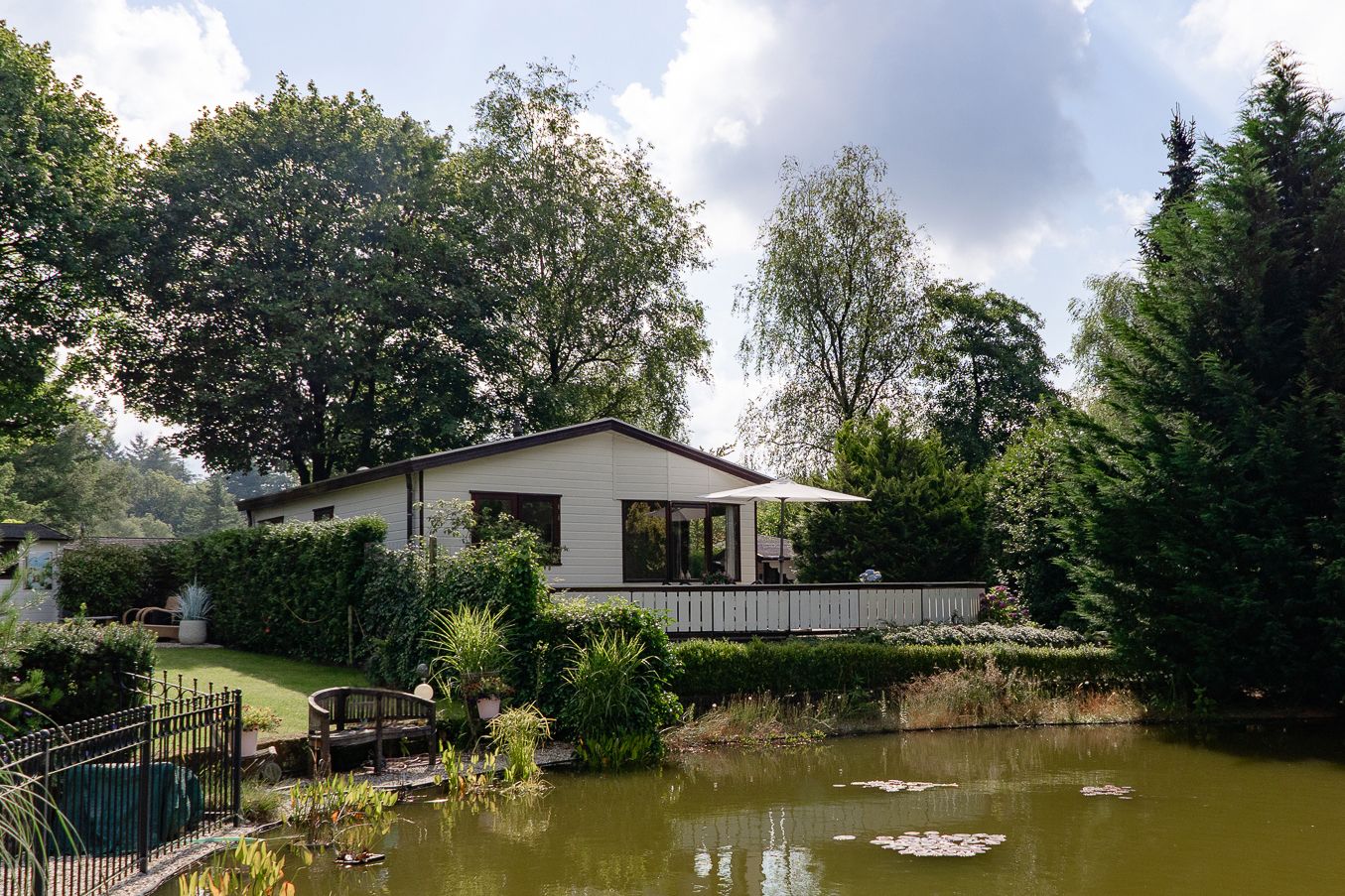 De tuin is gesitueerd aan de achterkant en zijkant van het chalet en bestaat voor een groot deel uit een verhoogd terras, deze loopt door van de zijkant naar de achterkant en is met een houten balustrade afgescheiden van de vijver. Voor direct contact met de vijver kun je een ommetje maken langs het verlaagde deel aan de vijver.