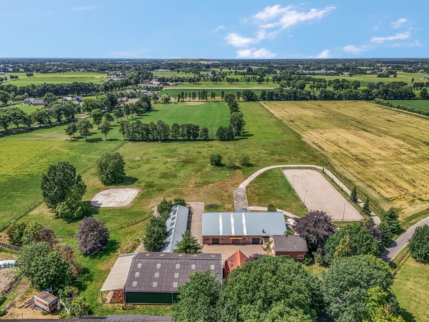Buitenrijbaan, er is een grote buitenrijbaan (afmeting 20 m x 60 m) met acht lantaarnpalen, een sproeiautomaat en natuurzand. Volledig gedraineerd.