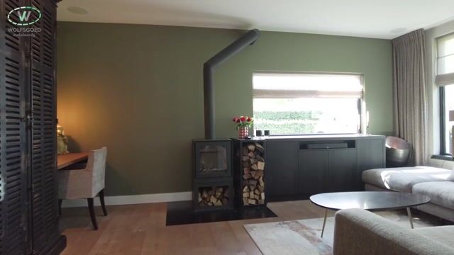 Middels fraaie en-suite schuifdeuren betreedt u de aangrenzende woonkamer, die eveneens met gevoel voor stijl is afgewerkt. De houten vloer, strak gestucte wanden en plafonds creëren een rustgevende sfeer. Grote raampartijen zorgen voor een prachtige lichtinval en bieden een weids uitzicht over de voortuin. Een houtkachel (ter overname) zorgt voor extra sfeer en behaaglijkheid. Bovendien is de volledige begane grond uitgerust met vloerverwarming.
