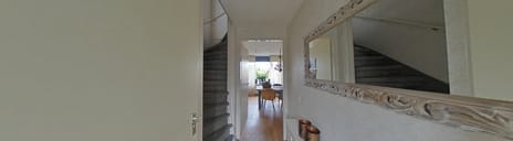 * Overdekte entree, hal voorzien van parket vloer, meterkast, trapopgang en licht betegeld zwevend toilet met fonteintje.