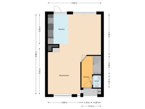 - 70 m² (12,24 meter diep en 5,70 meter breed)