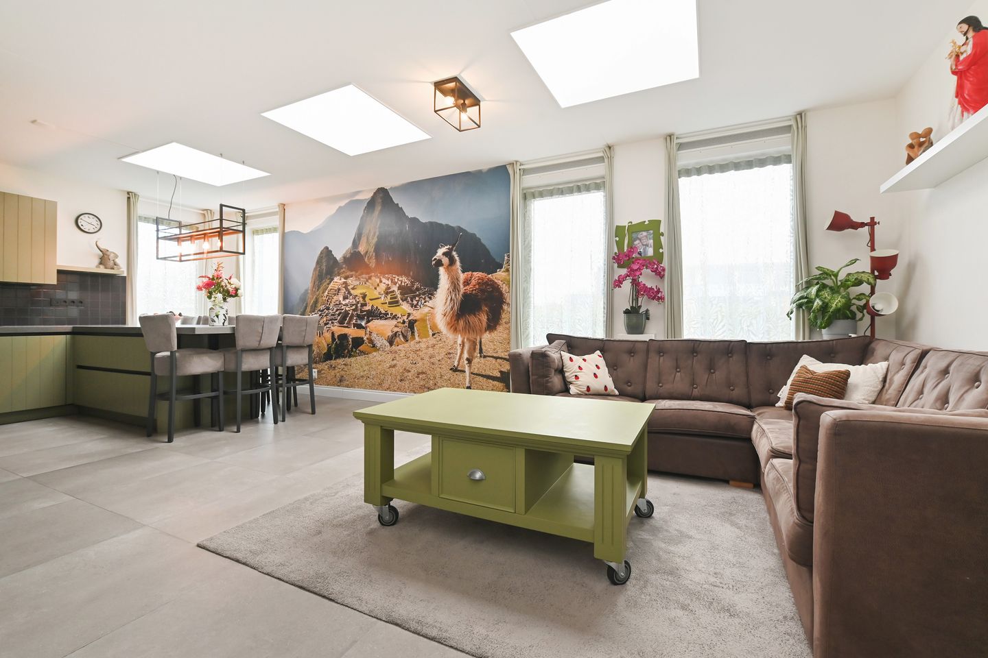 Grote wooneetkamer (ca. 5.19 x 5.01m) met fraaie vloer met vloerverwarming en lichtkoepels voor veel natuurlijk lichtinval.